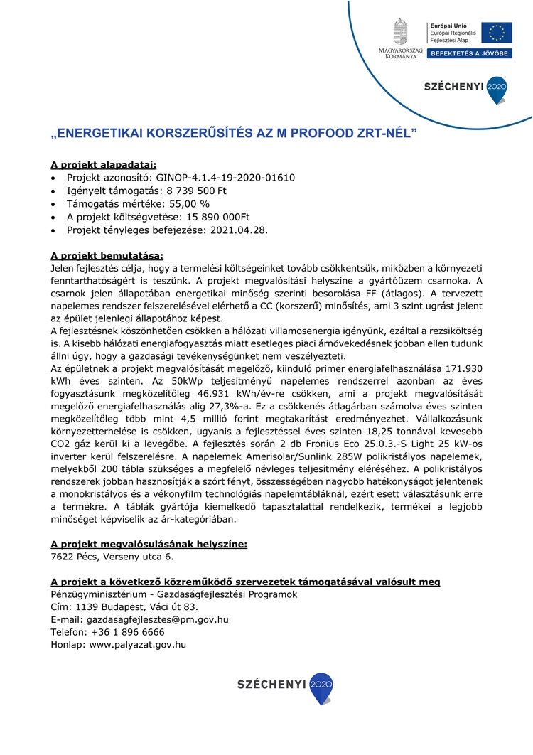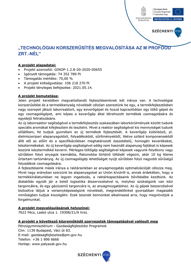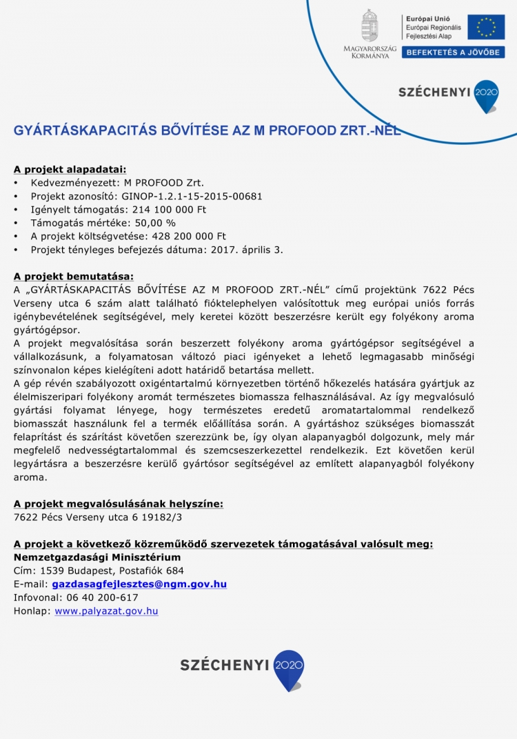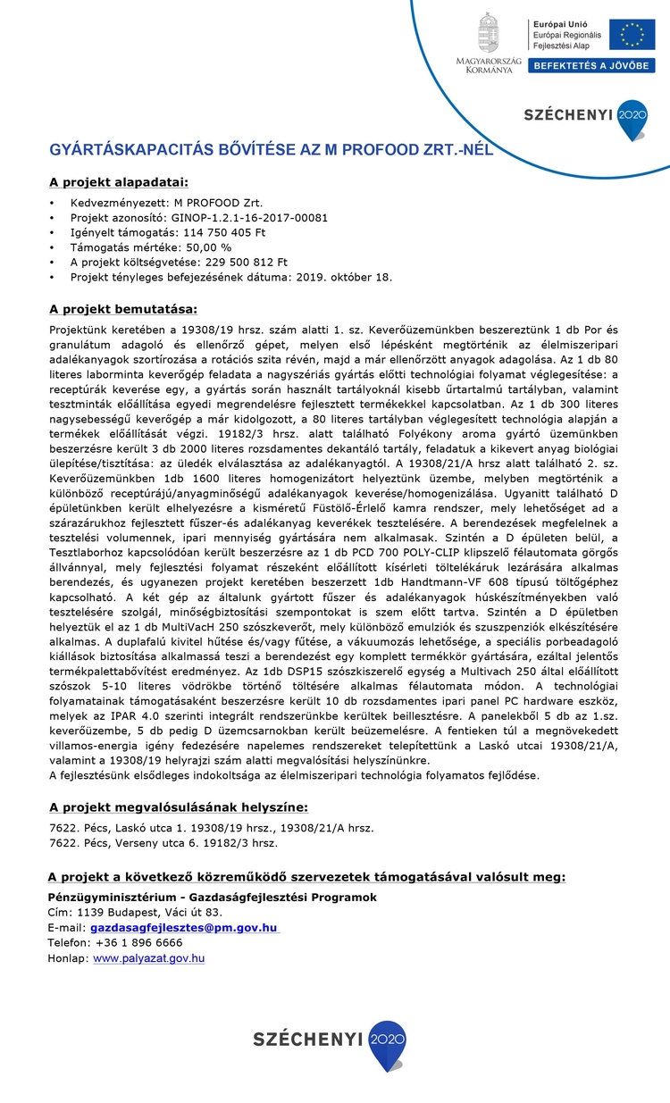 A „gyártáskapacitás bővítése az M Profood Zrt.-nél” valamint a „külpiaci megjelenés az M Profood Zrt.-nél” projektek keretében vállalatunk tovább tudta növelni a termelést, és ezáltal gazdasági versenyképességét.